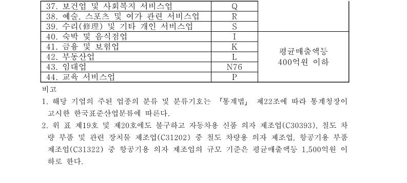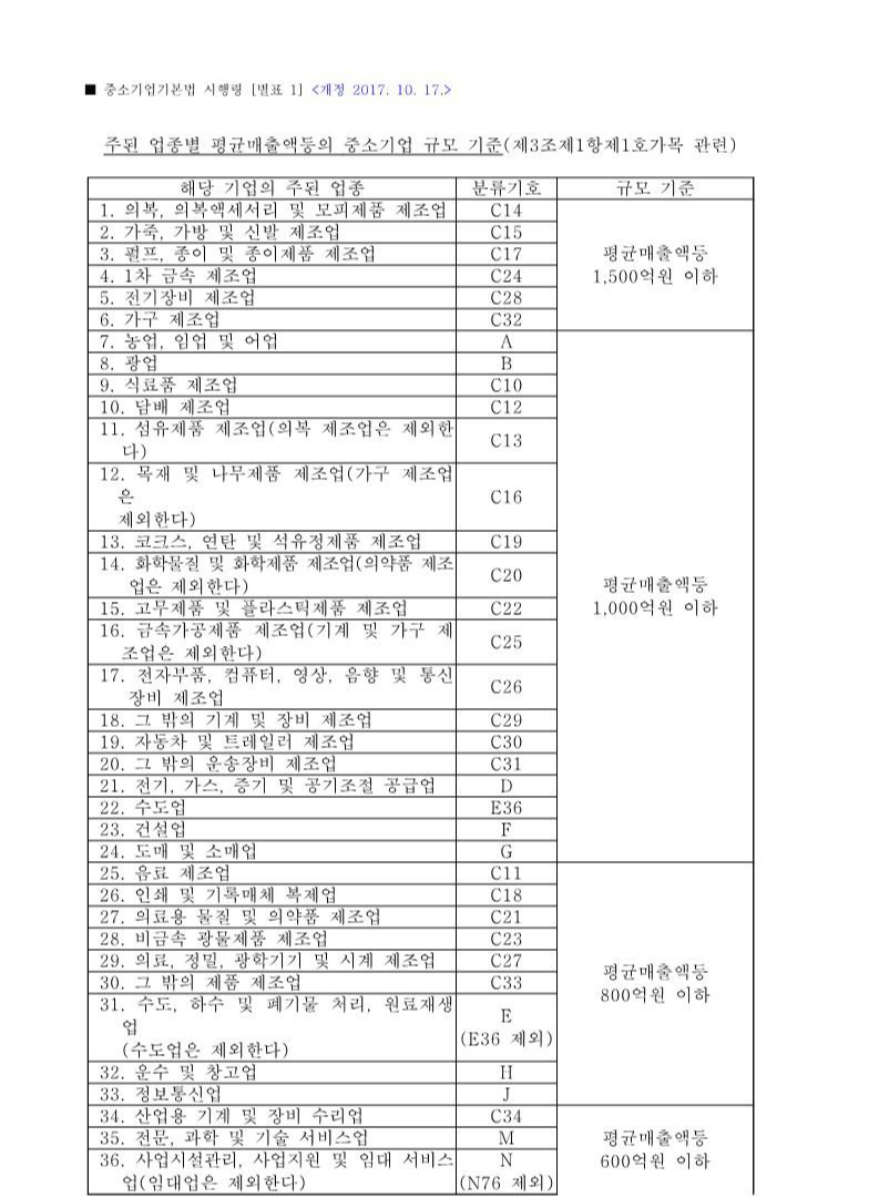 - 매출액이 업종별로 중소기업기본법 시행령 별표 1에 따른 규모 기준 이내일 것