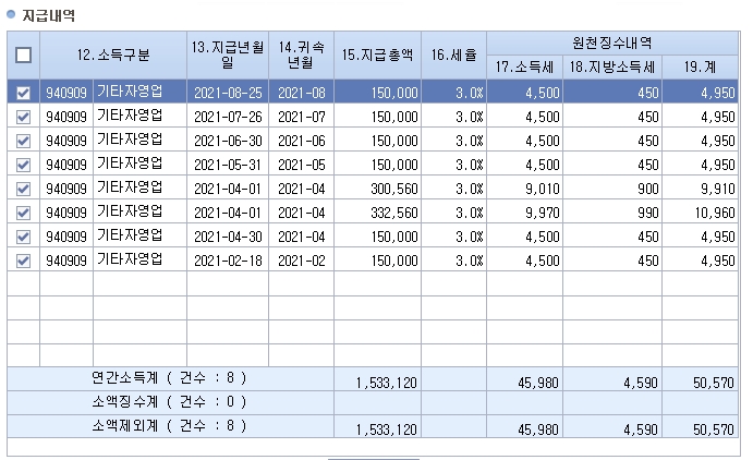 예를 들면 번역가가 2021년 8월 발생된 사업소득 금액이 8,000,000원인 경우