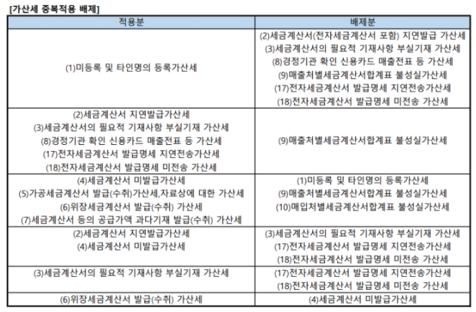 - 가공 발급 및 수취 가산세 : 실제로 재화 또는 용역의 공급 없이 세금계산서 등을 발급하거나 수취한 경우에 발생하는 가산세입니다. 공급가액의 3% 가산세가 발생됩니다.