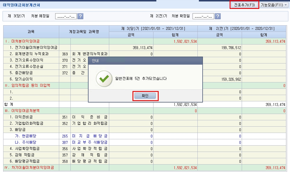 결산하는 방법은 제일 먼저 결산자료 입력에서 재고액이 있다면 재고액을 기재, 감가상각비 입력 등을 하고 전표 추가를 클릭합니다. 그리고 원가가 있다면 원가명세서를 들어가서 확인해 준 다음 손익계산서를 들어가고 이익잉여금처분계산서도 들어가서 전표추가를 클릭합니다. 이 때 당기 처분예정일과 전기 처분 확정일을 기재한 후 전표추가를 해주셔야 합니다.
