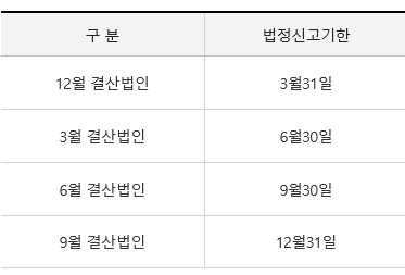 위 사진은 법인세 신고기한에 대한 내용입니다. 위 사진을 기준으로 법인세 중간예납 기한을 쉽게 알려드리겠습니다.
